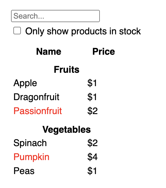 ProductTable(紫)を見ると、(“Name” と “Price” というラベルがある)テーブルヘッダ部分が、専用のコンポーネントになっていないことに気付くでしょう。これは好みの問題であり、どちらであっても構いません。今回の例ではヘッダは商品テーブル内に表示するものであるため、ProductTable の一部としています。ただし、このヘッダが複雑になる場合(例えばソート機能を追加する場合)、専用の ProductTableHeader コンポーネントに移動してもよいでしょう。